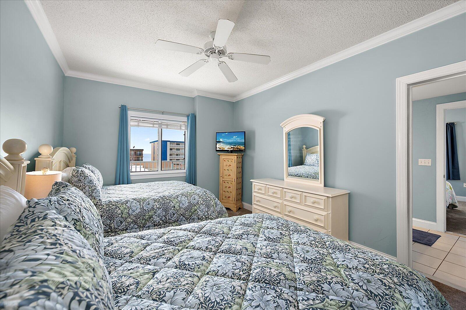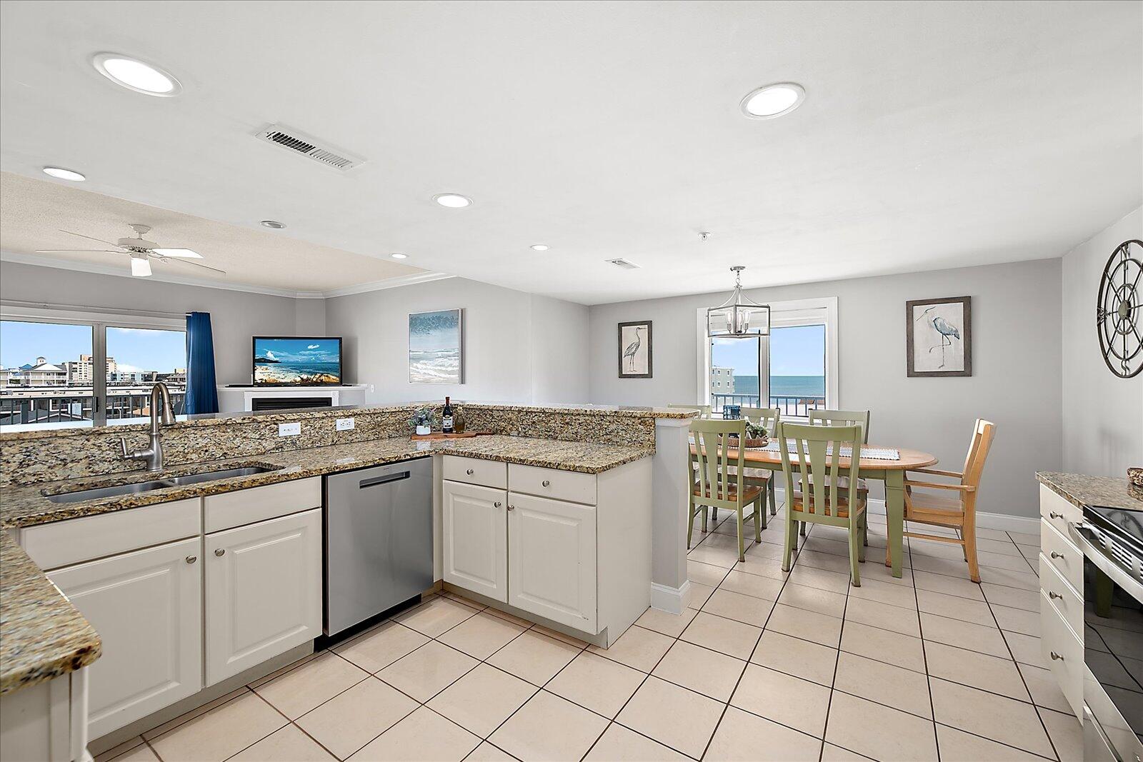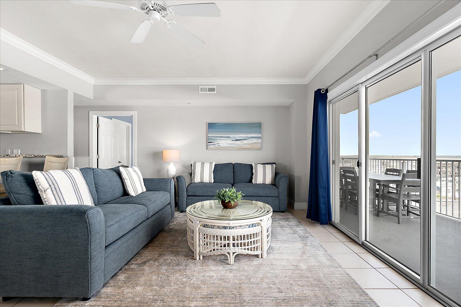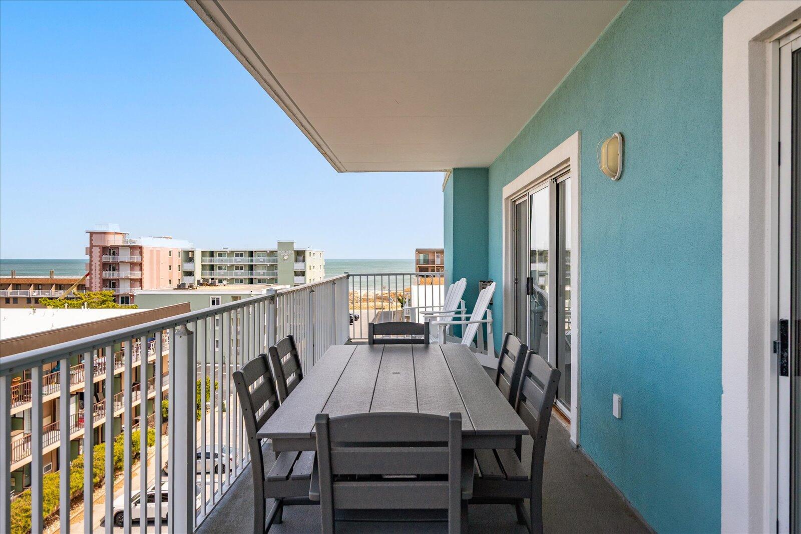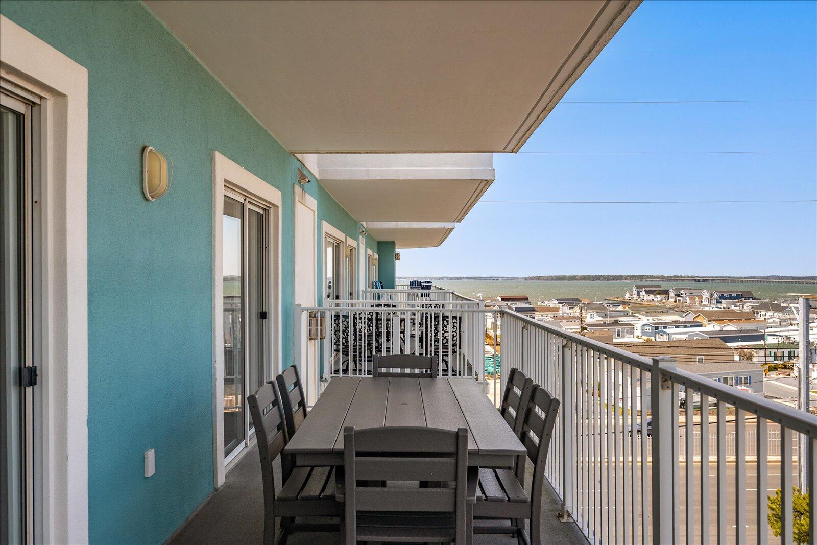 Enjoy both ocean and bay views from this well-appointed unit, designed for relaxing beach vacations. The open living space is bright and inviting, featuring brand-new family room furniture for 2026, including two full-size sofas—perfect for gathering after a day in the sun. Step outside to a large private balcony complete with an outdoor dining table and Adirondack chairs—perfect for morning coffee or evening relaxation. Stay entertained with 5 TVs equipped with streaming services and 3 DVD players throughout the condo.