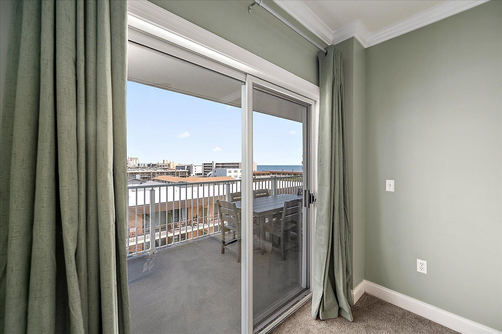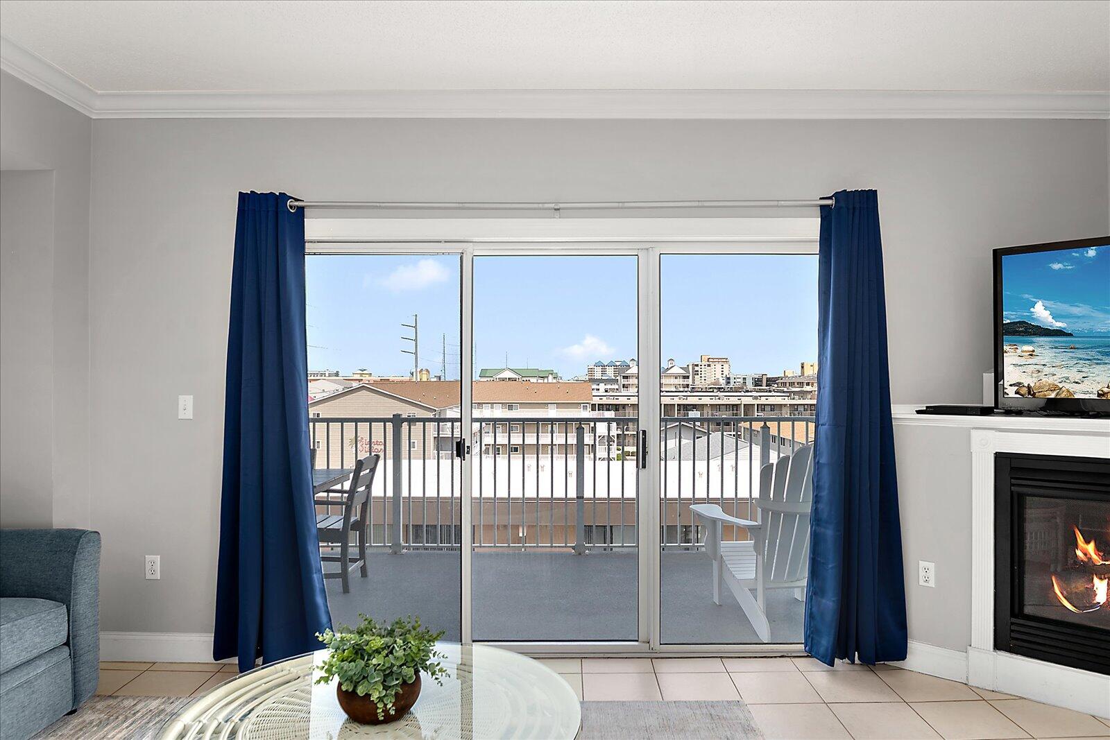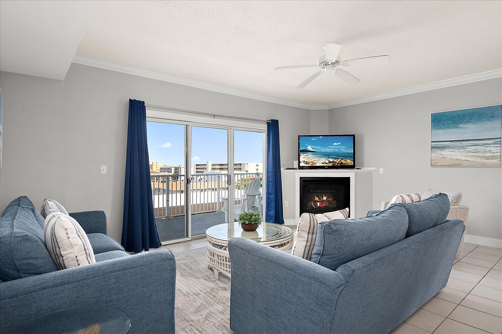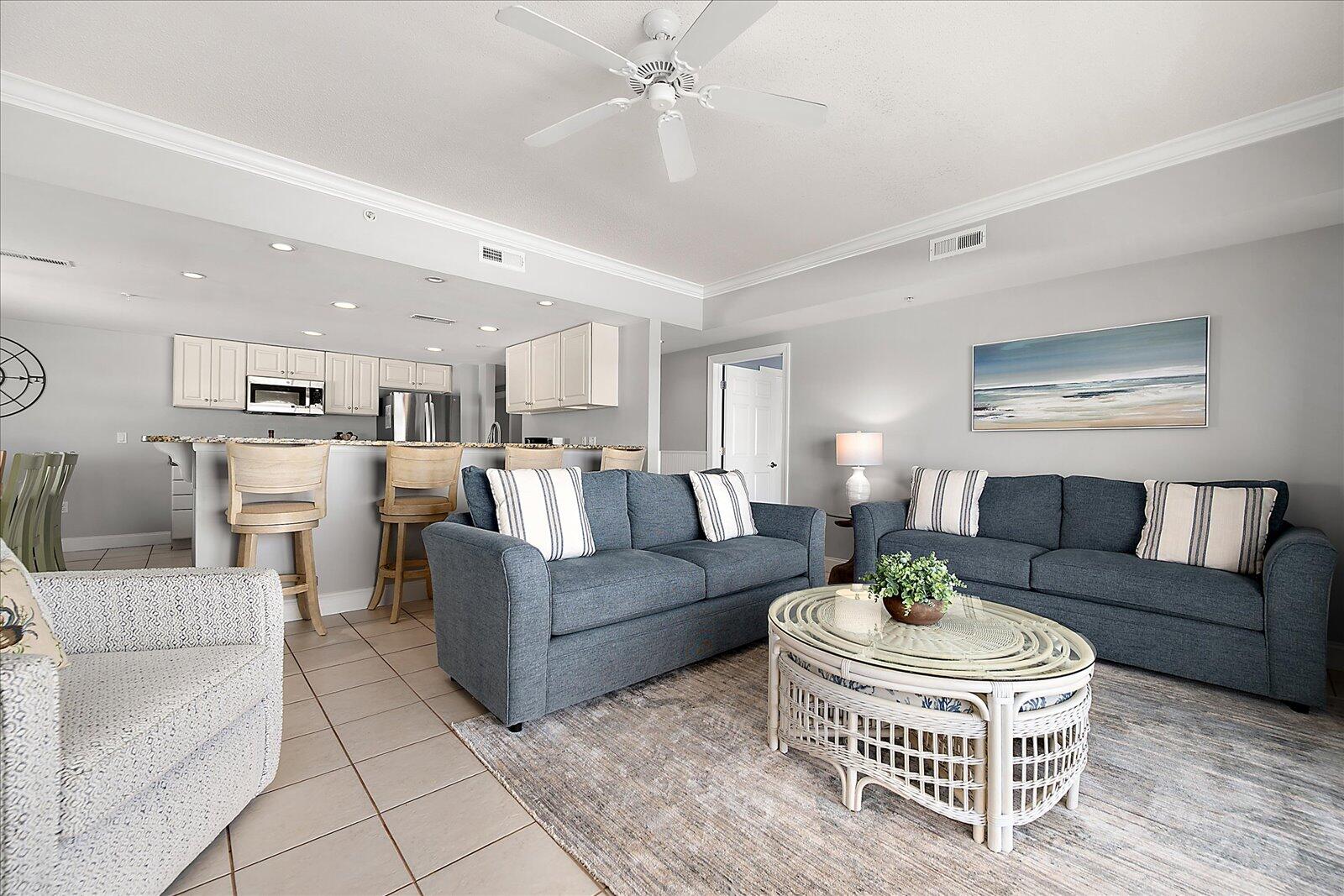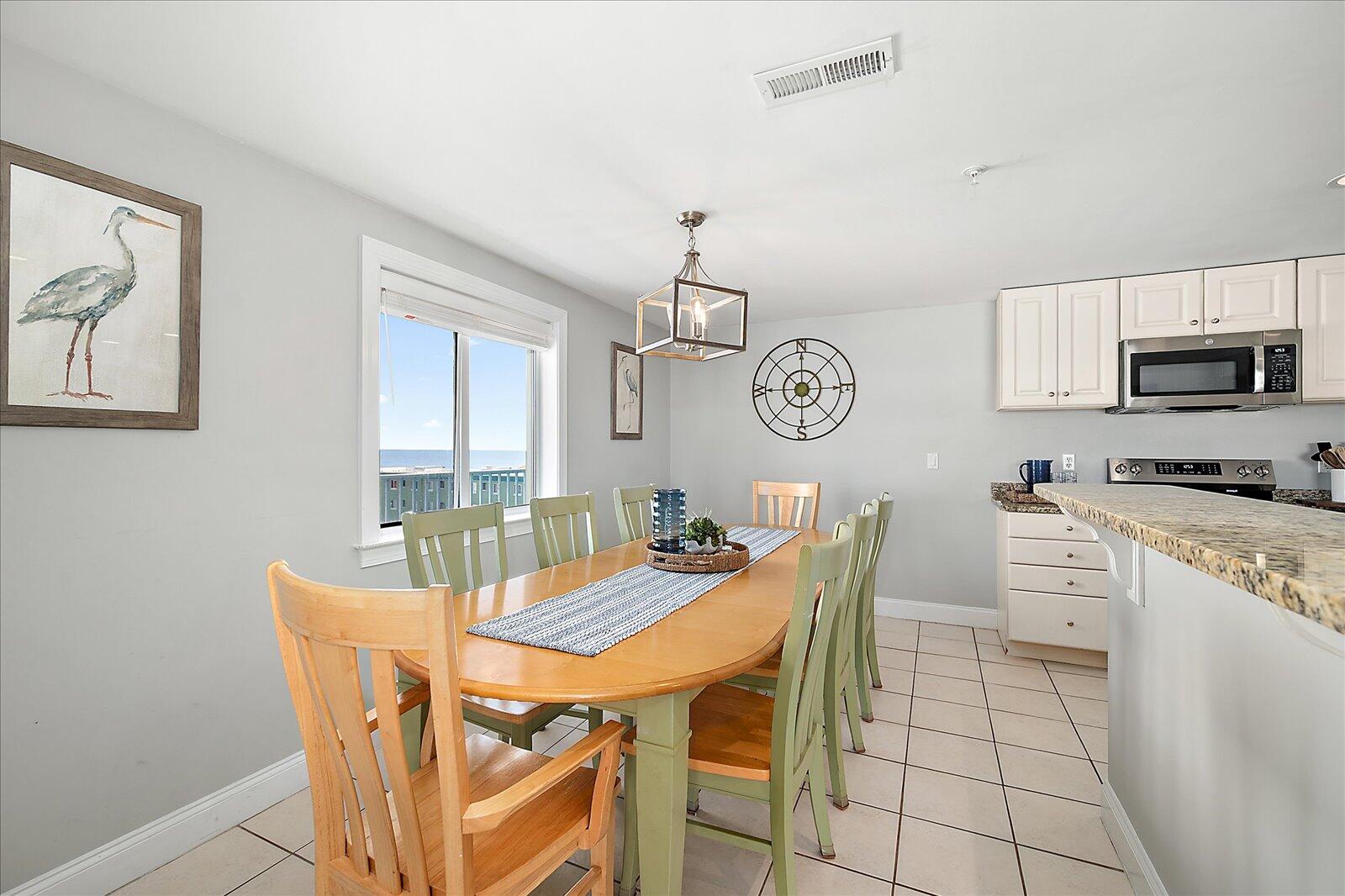 Enjoy both ocean and bay views from this well-appointed unit, designed for relaxing beach vacations. The open living space is bright and inviting, featuring brand-new family room furniture for 2026, including two full-size sofas—perfect for gathering after a day in the sun. Step outside to a large private balcony complete with an outdoor dining table and Adirondack chairs—perfect for morning coffee or evening relaxation. Stay entertained with 5 TVs equipped with streaming services and 3 DVD players throughout the condo.