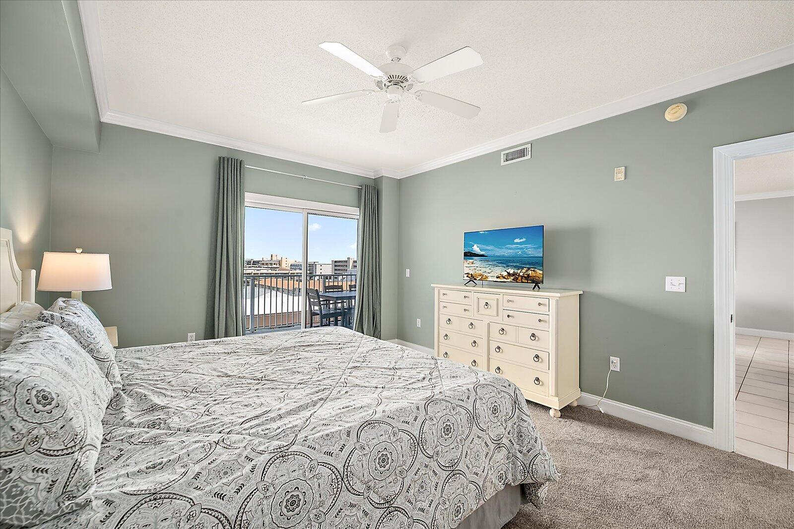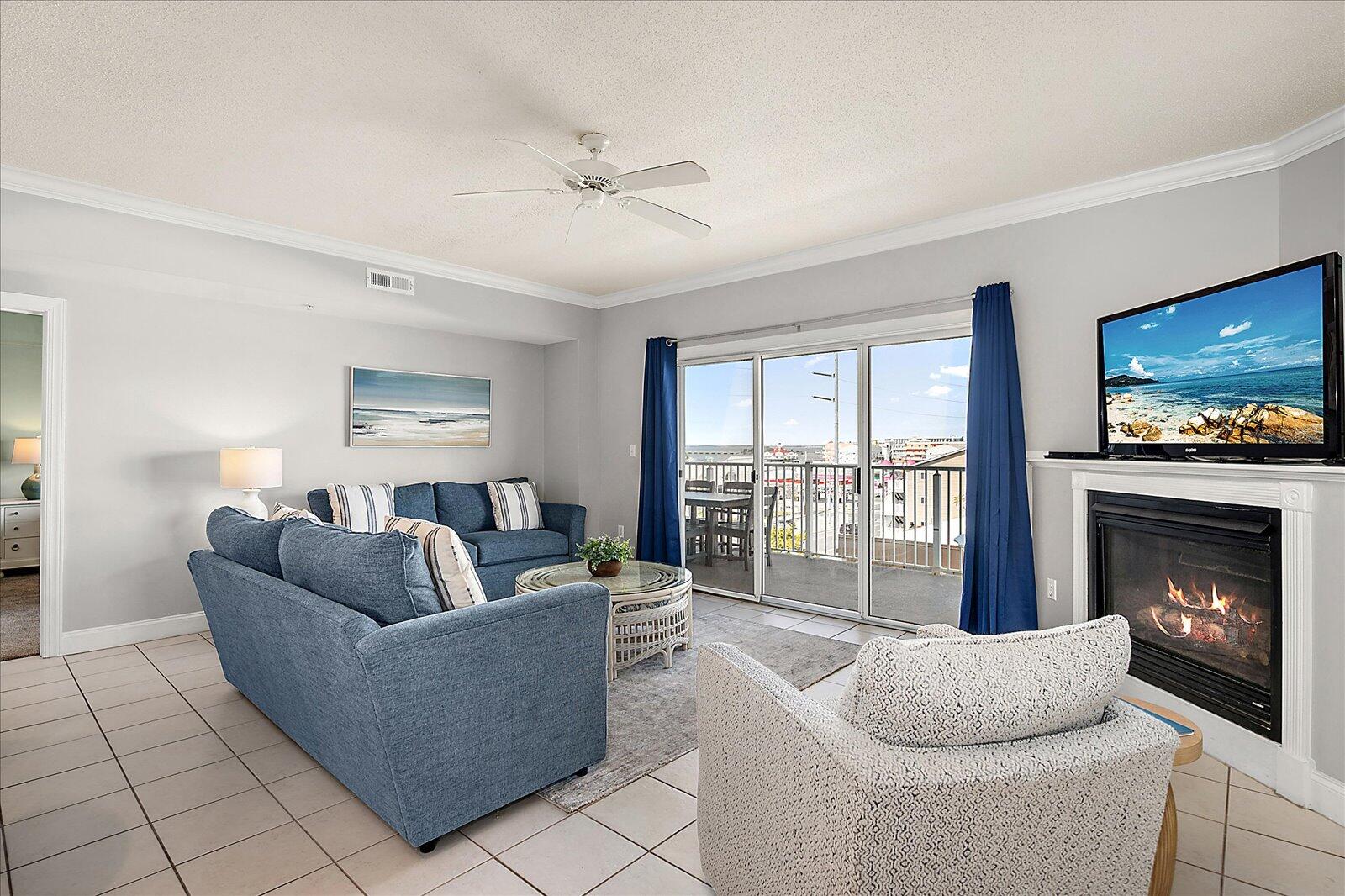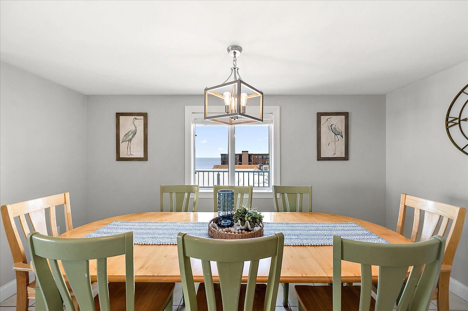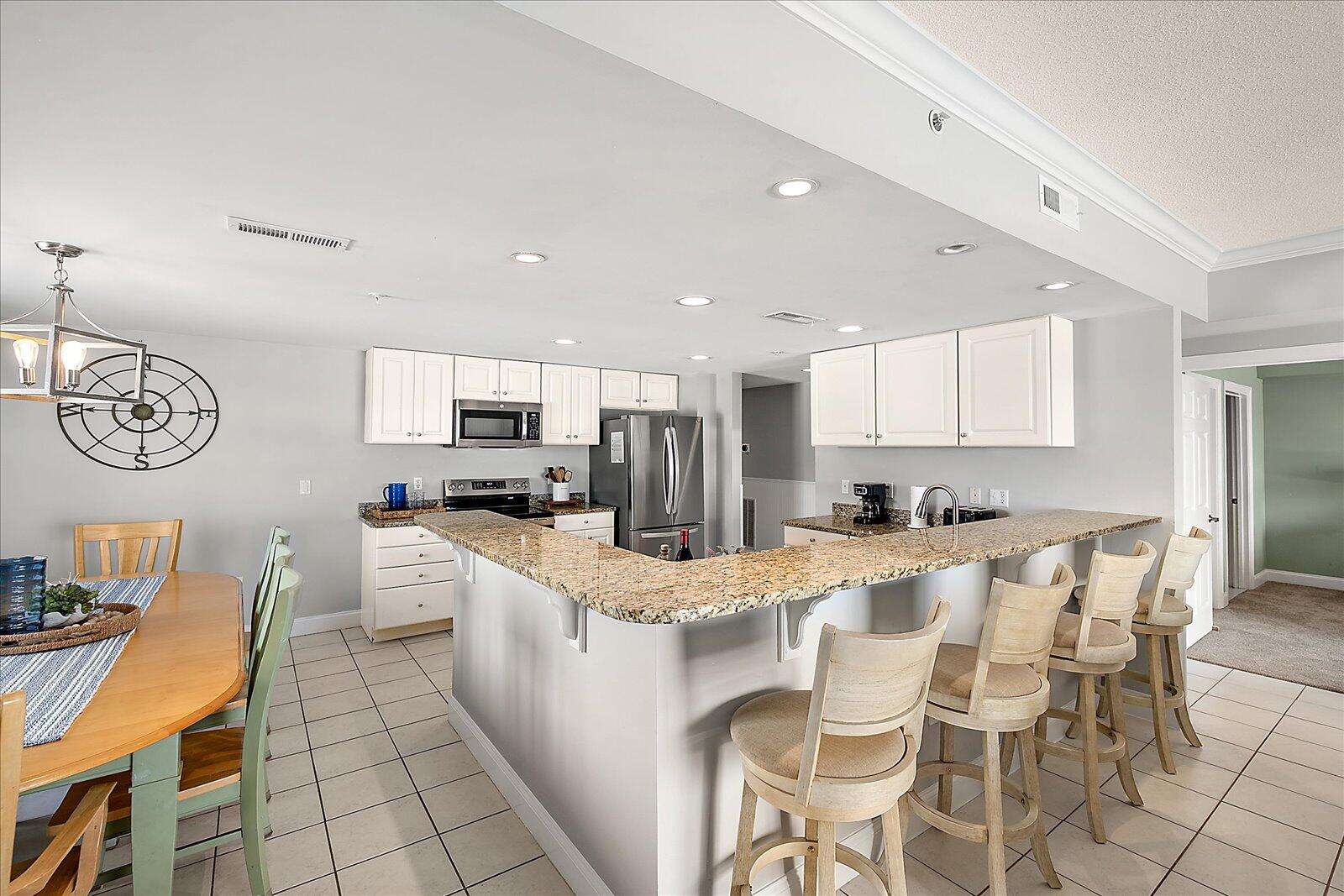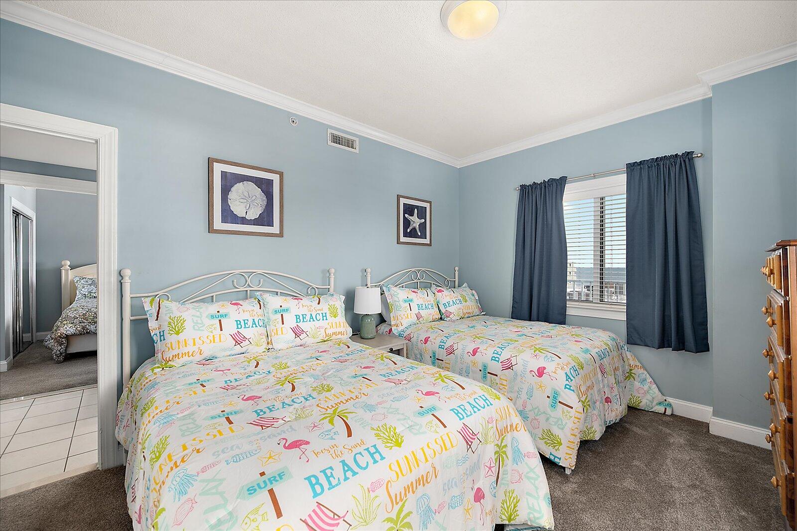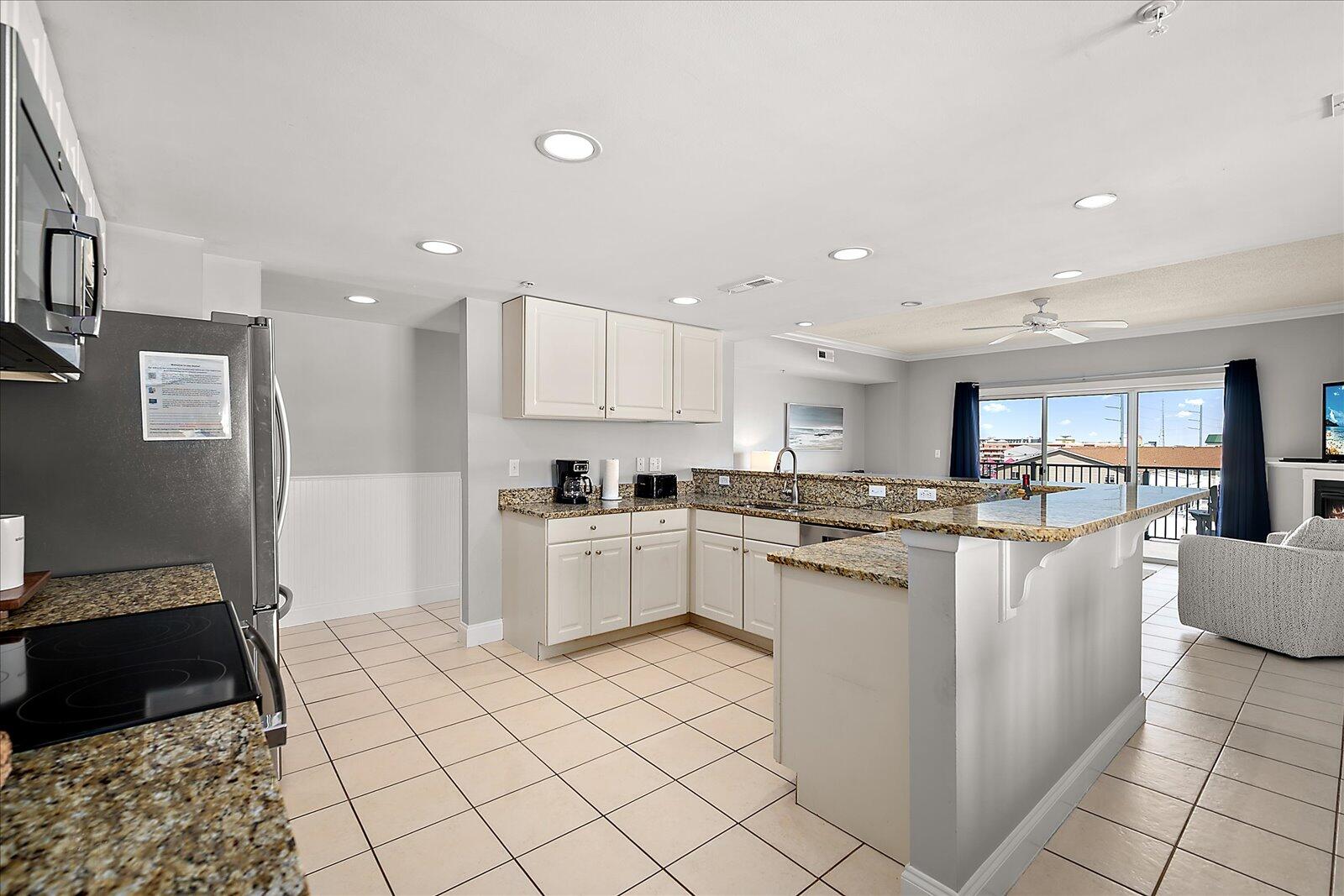 Enjoy both ocean and bay views from this well-appointed unit, designed for relaxing beach vacations. The open living space is bright and inviting, featuring brand-new family room furniture for 2026, including two full-size sofas—perfect for gathering after a day in the sun. Step outside to a large private balcony complete with an outdoor dining table and Adirondack chairs—perfect for morning coffee or evening relaxation. Stay entertained with 5 TVs equipped with streaming services and 3 DVD players throughout the condo.