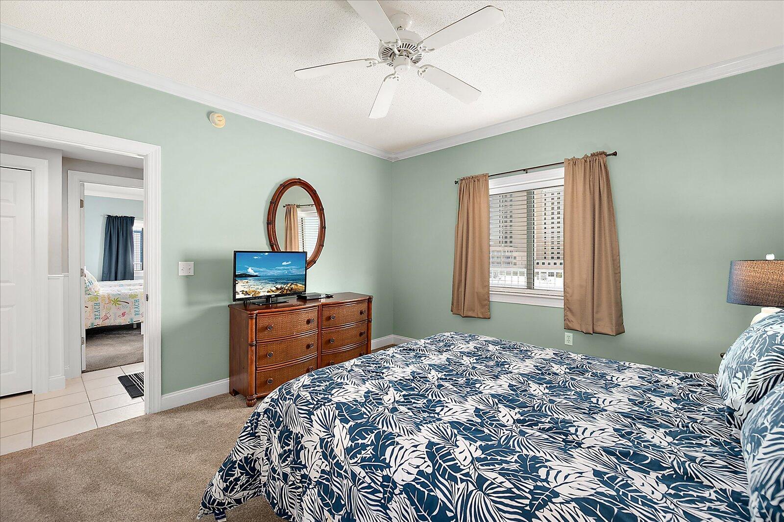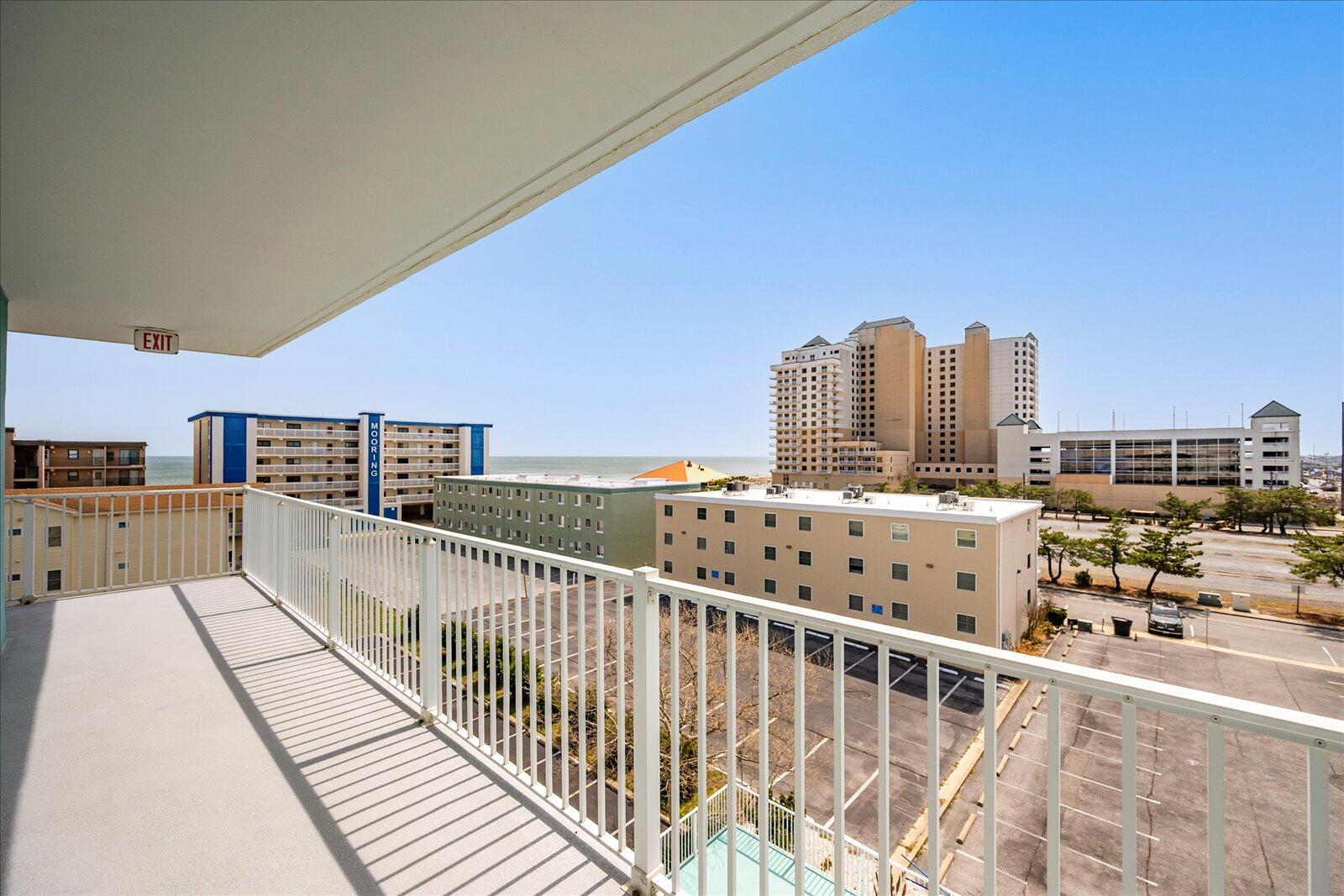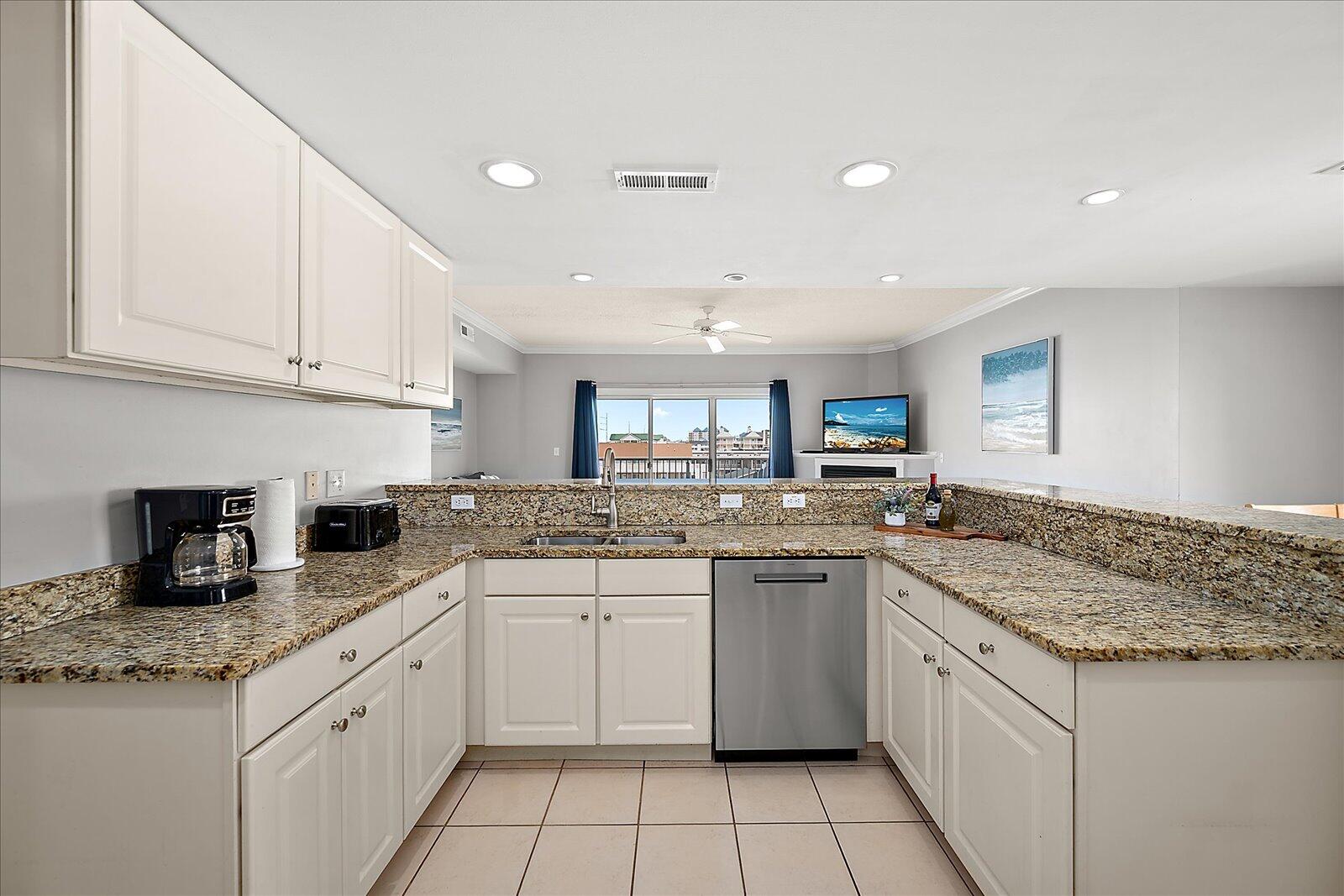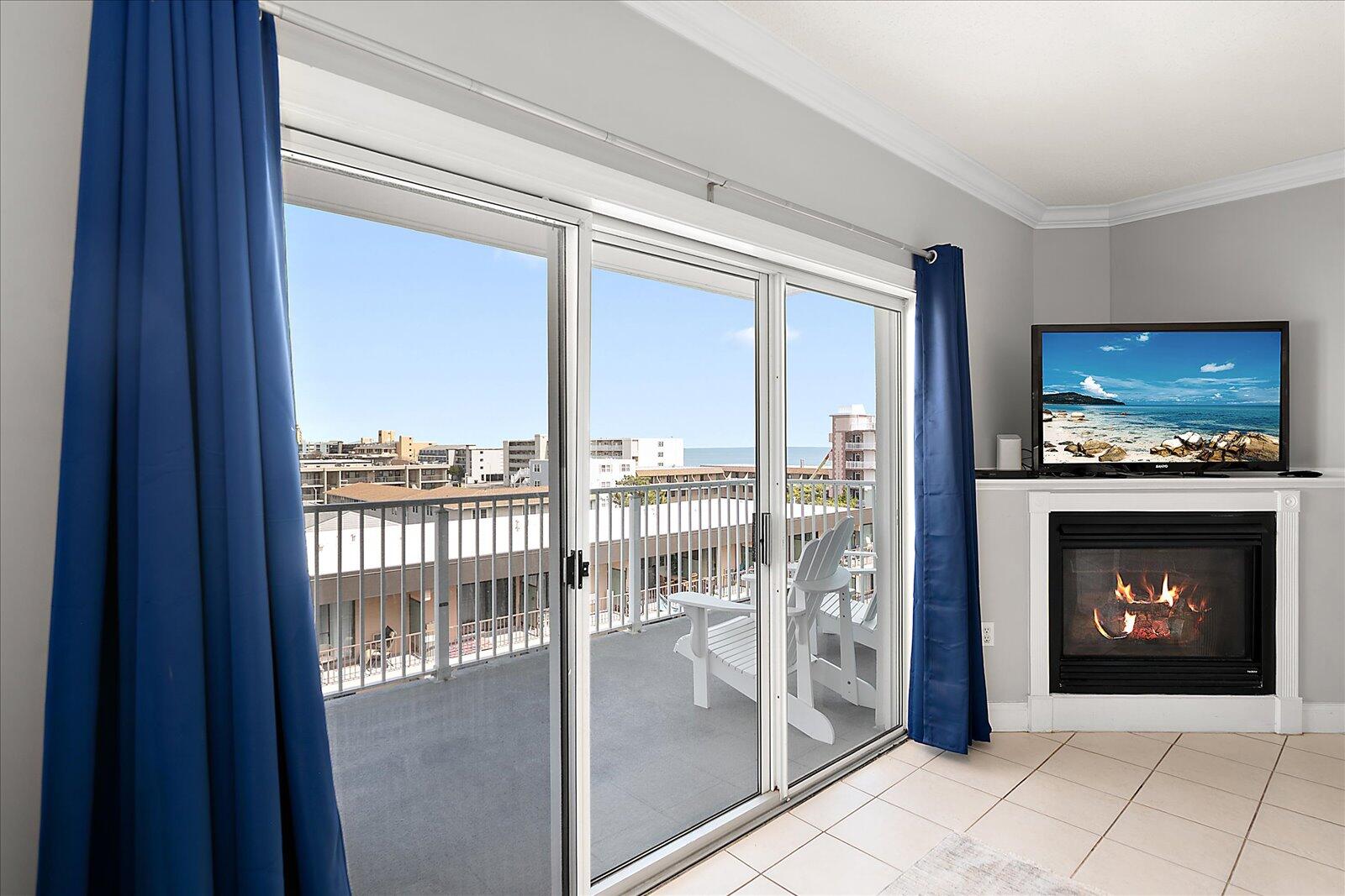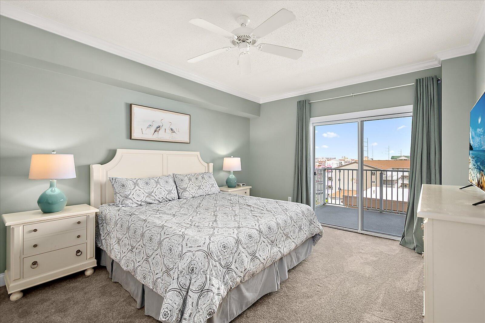 Enjoy both ocean and bay views from this well-appointed unit, designed for relaxing beach vacations. The open living space is bright and inviting, featuring brand-new family room furniture for 2026, including two full-size sofas—perfect for gathering after a day in the sun. Step outside to a large private balcony complete with an outdoor dining table and Adirondack chairs—perfect for morning coffee or evening relaxation. Stay entertained with 5 TVs equipped with streaming services and 3 DVD players throughout the condo.