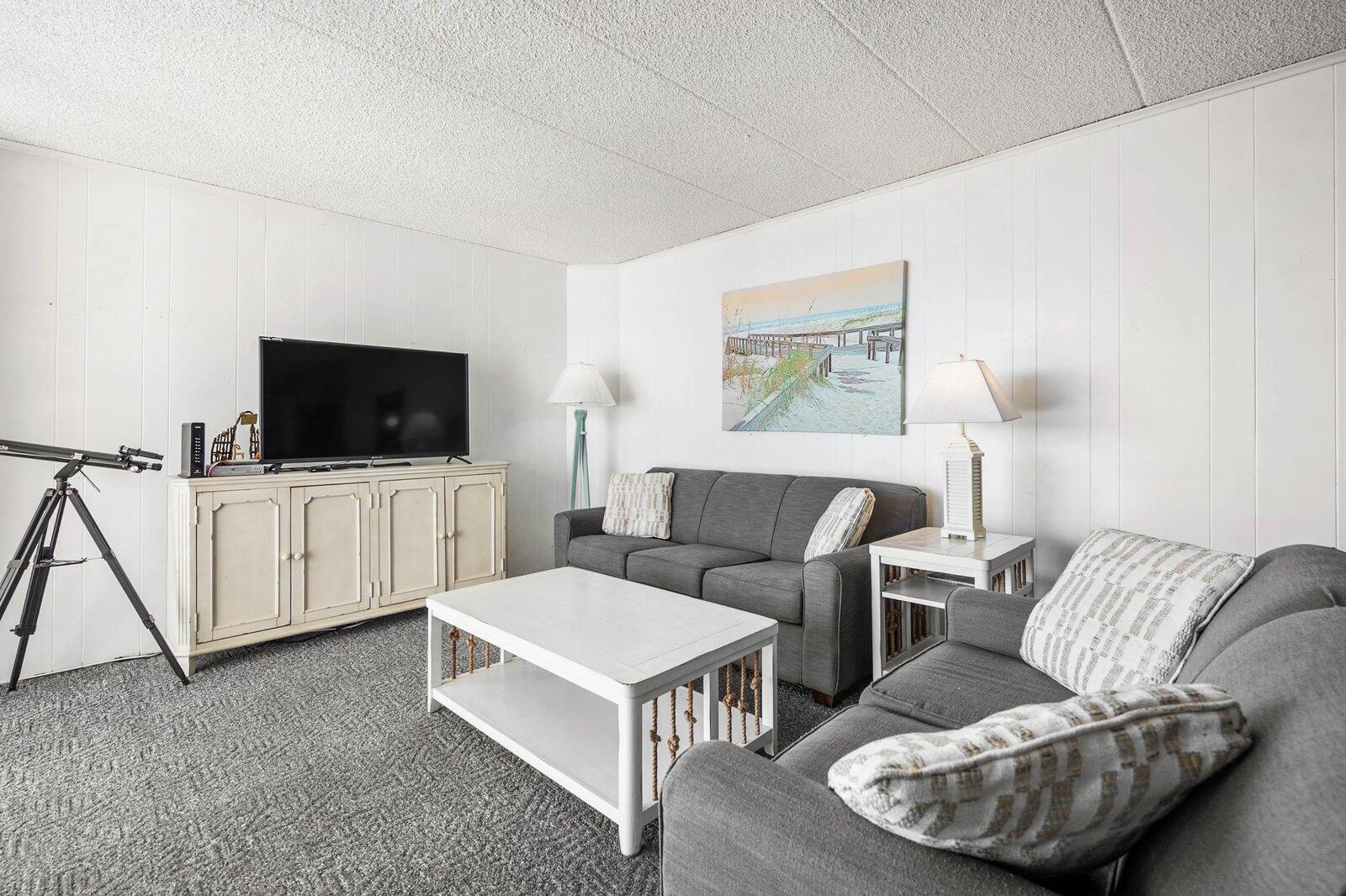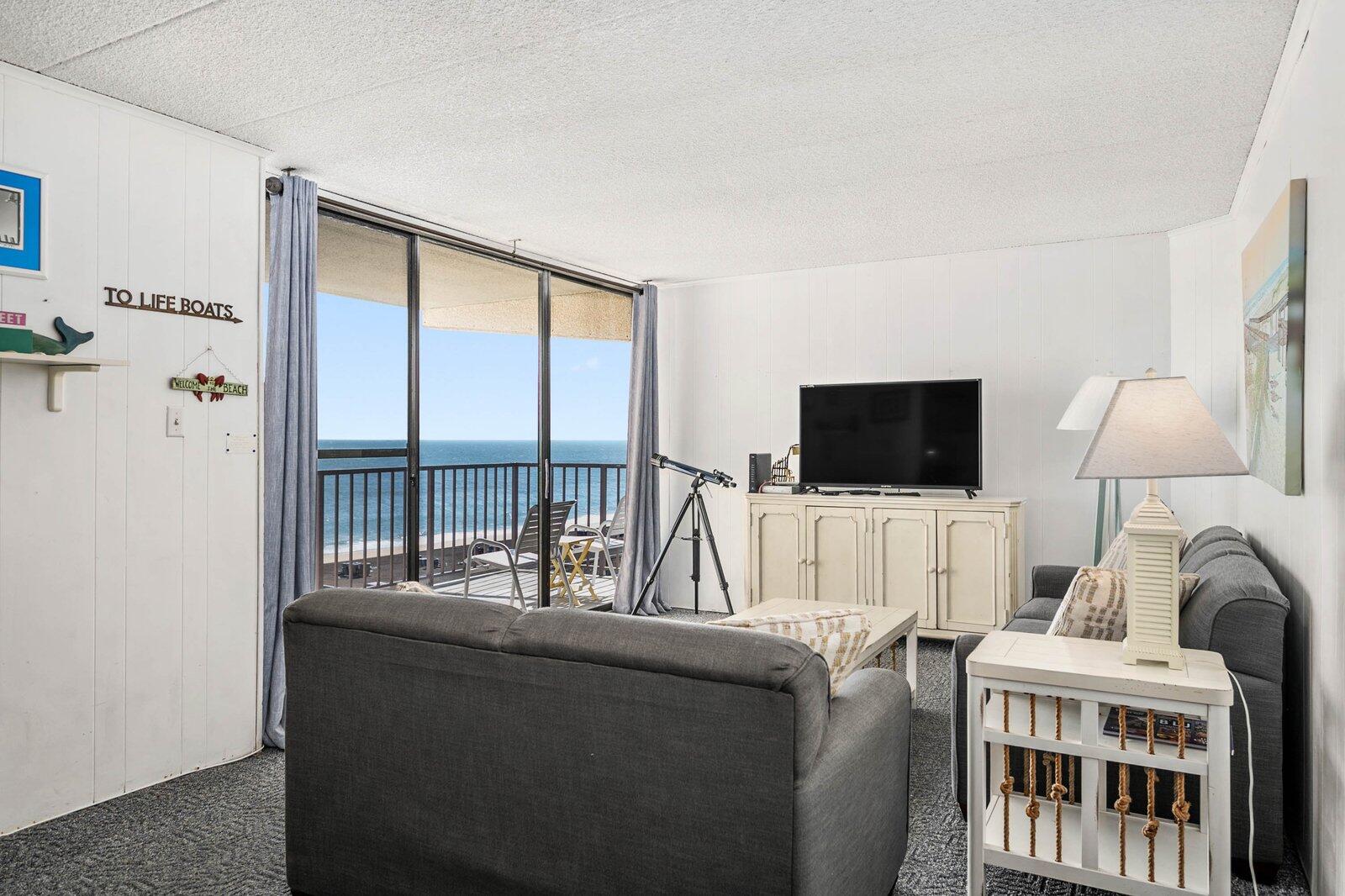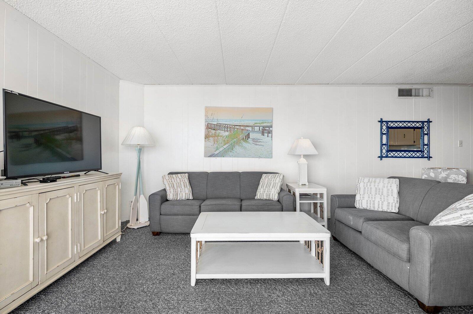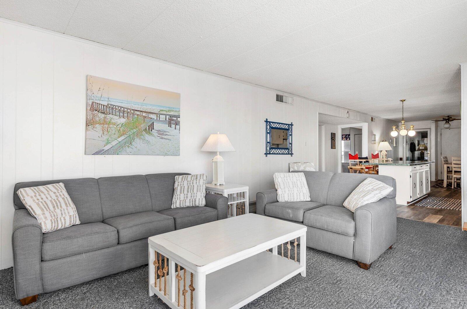 Enjoy great ocean views from the living room and balcony of this spacious 2-bedroom condo. With a large outdoor pool, this building is a family favorite—make plans to return year after year! The condo features a full kitchen, washer/dryer, microwave, 2 TVs, free Wi-Fi, central A/C, and parking for 1 car. Smoking is prohibited in the unit, building, and on the grounds. Animals are not allowed. Maximum occupancy is 8. Please note – sheets, towels, paper and cleaning products not supplied. A linen package including sheets and towels can be rented for an extra charge.
